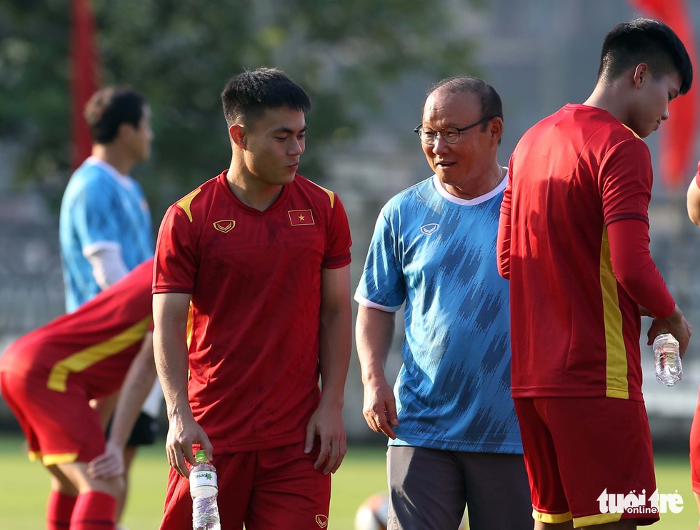 Ông Park đá bóng qua hai chân tiền đạo Tiến Linh để trêu cậu học trò - Ảnh: N.K